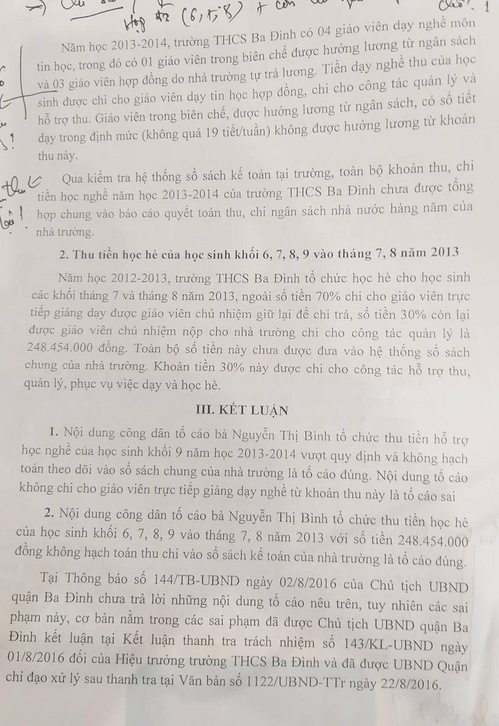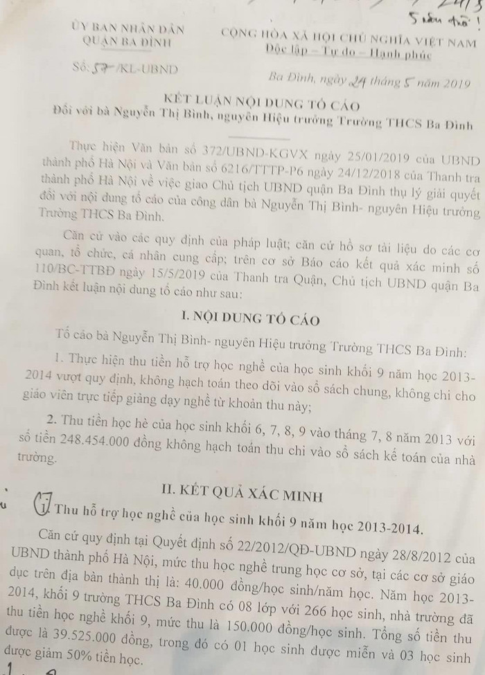Theo kết quả xác minh của Ủy ban nhân dân quận Ba Đình ngày 24/5 thì theo quy định là thu học nghề trung học cơ sở là 40.000 đồng nhưng nhà trường đã thu 150 nghìn đồng, với tổng tiền là hơn 39 triệu đồng.