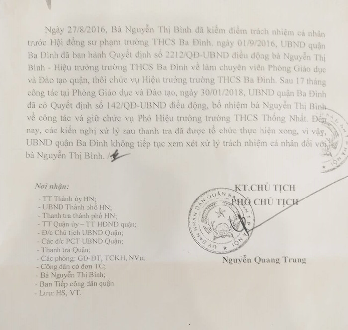 Đơn thư còn nêu: “Đến nay, các kiến nghị xử lý sau thanh tra đã được tổ chức thực hiện xong, vì vậy Ủy ban nhân dân quận Ba Đình không tiếp tục xem xét xử lý trách nhiệm cá nhân đối với bà Nguyễn Thị Bình”.