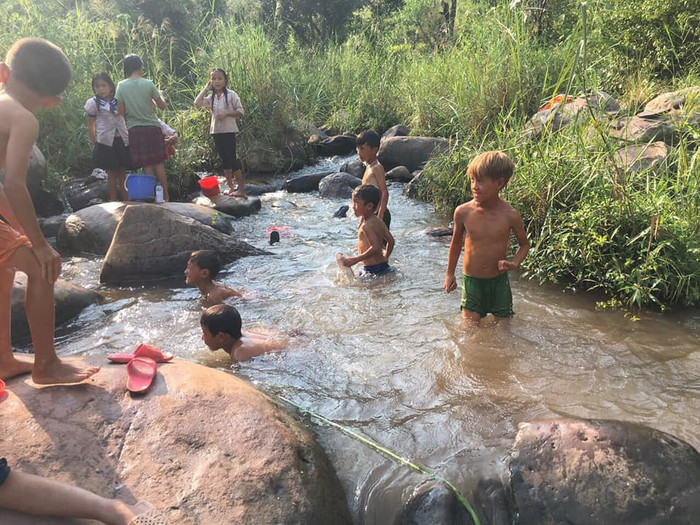 ở Na Cô Sa, những ngày này, sau giờ học các em học sinh bán trú lại đi ra những khu vực suối cách trường 2km lấy nước tắm gội, giặt rũ áo quần.