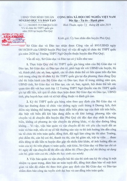 Từ thực tế trên, Sở Giáo dục và Đào tạo không đồng ý tổ chức kỳ thi trung học phổ thông quốc gia năm học 2019-2020 tại huyện đảo Phú Quý.