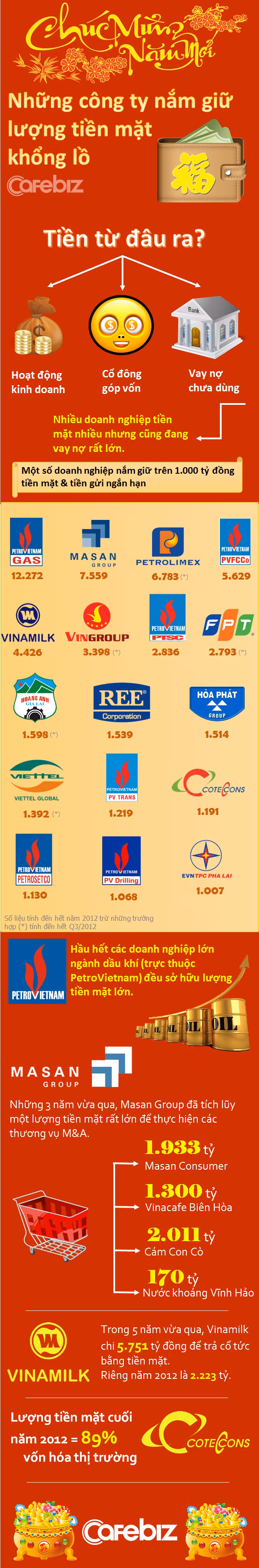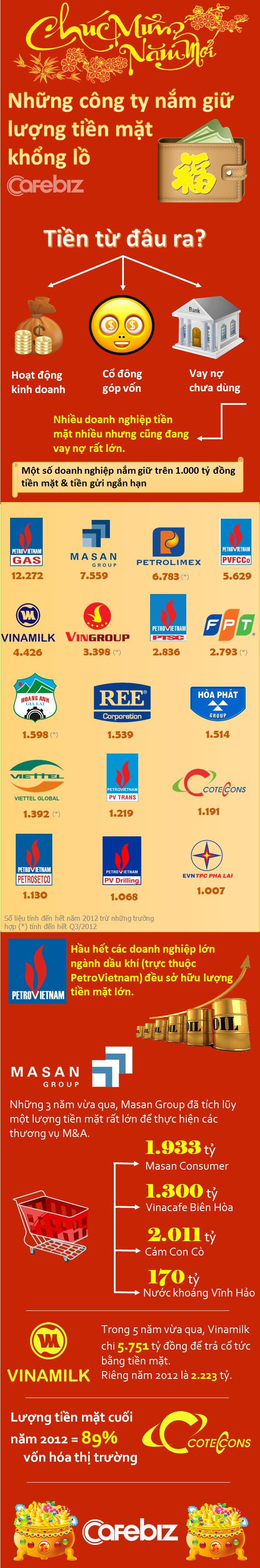 Đối với các doanh nghiệp, nguồn tiền mặt dồi dào phần nào phản ánh được sức khỏe tài chính cũng như kết quả kinh doanh. Dưới đây là một số doanh nghiệp đang nắm trong tay hàng nghìn tỷ đồng tiền mặt (bao gồm cả các khoản tiền gửi ngắn hạn dưới 1 năm):