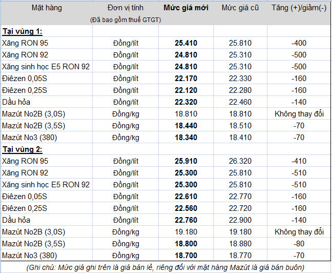 Theo mức giá mới được công bố, tại vùng 1, giá xăng RON 92 sẽ có giá mới là 24.810 đồng/lít, giảm 500 đồng/lít so với trước đó. Giá xăng RON 95 giảm 400 đồng/lít với mức giá mới 25.410 đồng/lít. Giá dầu Diezen 0,05S và 0,25S cùng có mức giảm 16 đồng/lít.