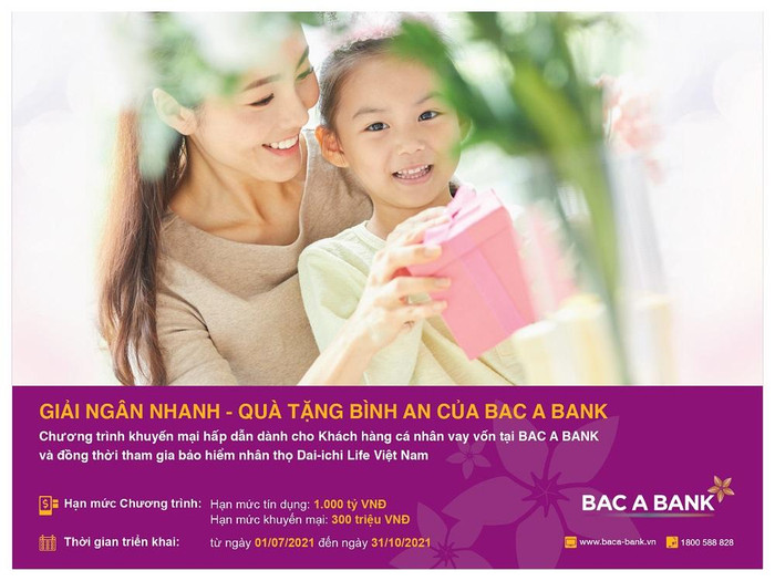 Chương trình “Giải ngân nhanh - Quà tặng bình an của BAC A BANK” được triển khai từ ngày 01/07/2021 đến 31/10/2021 tại hệ thống các chi nhánh, phòng giao dịch trên phạm vi toàn quốc. Điều kiện tham gia rất đơn giản: Khách hàng là cá nhân vay vốn tại BAC A BANK đồng thời đăng ký tham gia sản phẩm bảo hiểm nhân thọ của Dai-ichi Life Việt Nam.