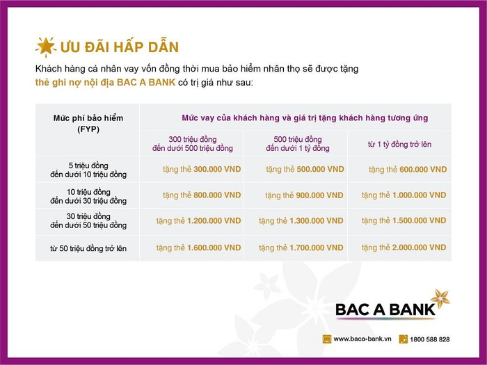 Theo đó, tùy Mức vay và Doanh thu hợp đồng bảo hiểm, khách hàng sẽ nhận được quà tặng thiết thực là thẻ ghi nợ nội địa BAC A BANK có giá trị tối đa lên tới 2 triệu đồng. Chương trình có tổng hạn mức tín dụng lên đến 1.000 tỷ đồng, hứa hẹn sẽ tối ưu và đáp ứng trọn gói nhu cầu đa đạng của khách hàng.