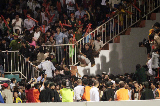| Khán giả đạp đổ cả hàng rào ngăn cách giữa khán đài với dưới sân... |