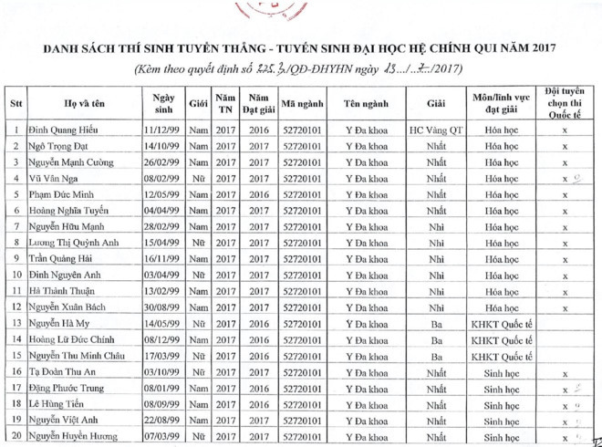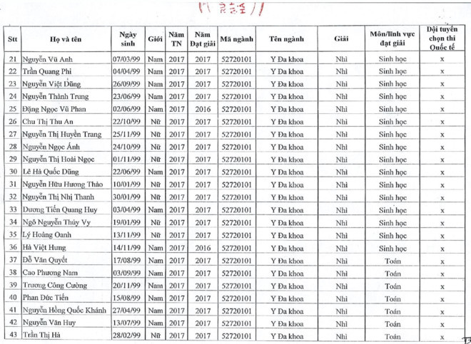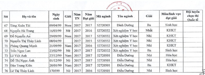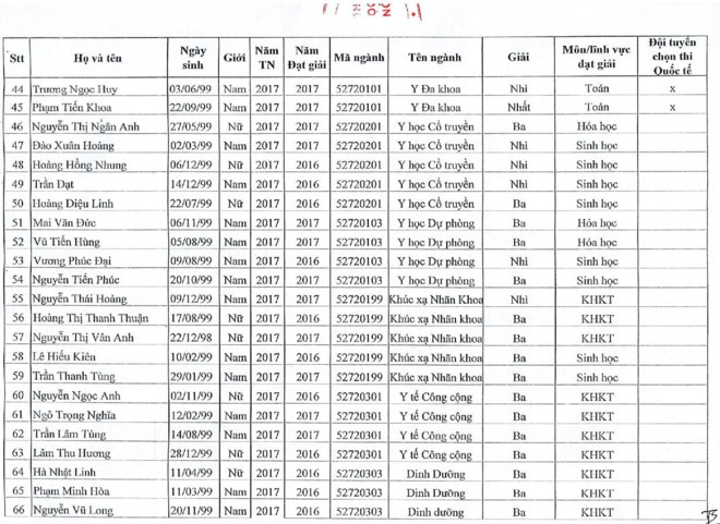 Danh sách 76 thí sinh được tuyển thẳng vào Đại học Y Hà Nội như sau:
