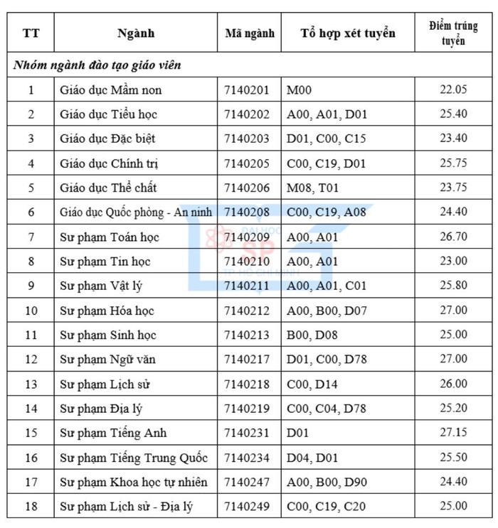 Với nhóm ngành đào tạo giáo viên, điểm trúng tuyển từ 22,05 - 27,15 điểm. Trong đó, dẫn đầu là ngành sư phạm tiếng Anh với 27,15 điểm. Các ngành sư phạm Ngữ văn, sư phạm Hóa học đều có điểm chuẩn là 27 điểm; ngành sư phạm Toán với điểm chuẩn là 26,70 điểm; điểm chuẩn ngành Giáo dục Tiểu học là 25,40 điểm..