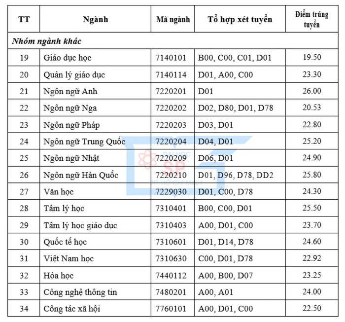 Đối với nhóm ngành khác, điểm trúng tuyển ngành cao nhất là ngôn ngữ Anh với 26 điểm; ngành ngôn ngữ Hàn Quốc có điểm chuẩn là 25,80 điểm; ngành Tâm lý học là 25,50 điểm.