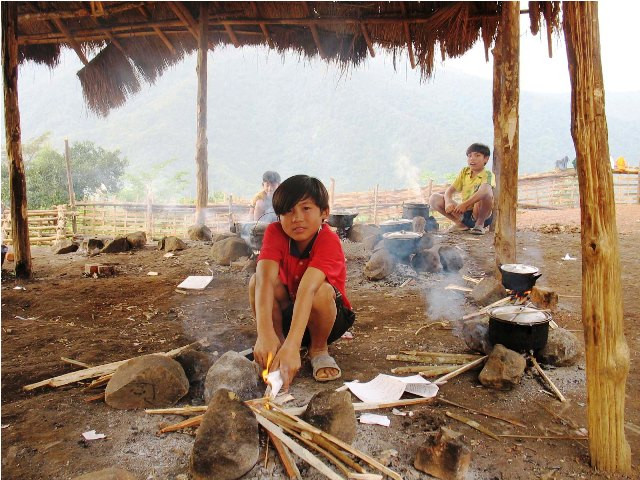 | Mỗi cháu một nồi, kê ba viên đá, chụm củi, chụm giấy vở học trò vào nấu cơm ăn, bốn bề gió thốc, không phên liếp che chắn |