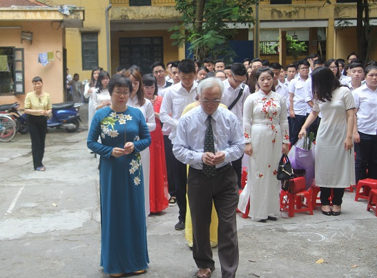 | Các thầy cô giáo và 10 học sinh đại diện cho khối 12 cùng dâng hương để tưởng nhớ về người Anh hùng dân tộc Đinh Tiên Hoàng. |