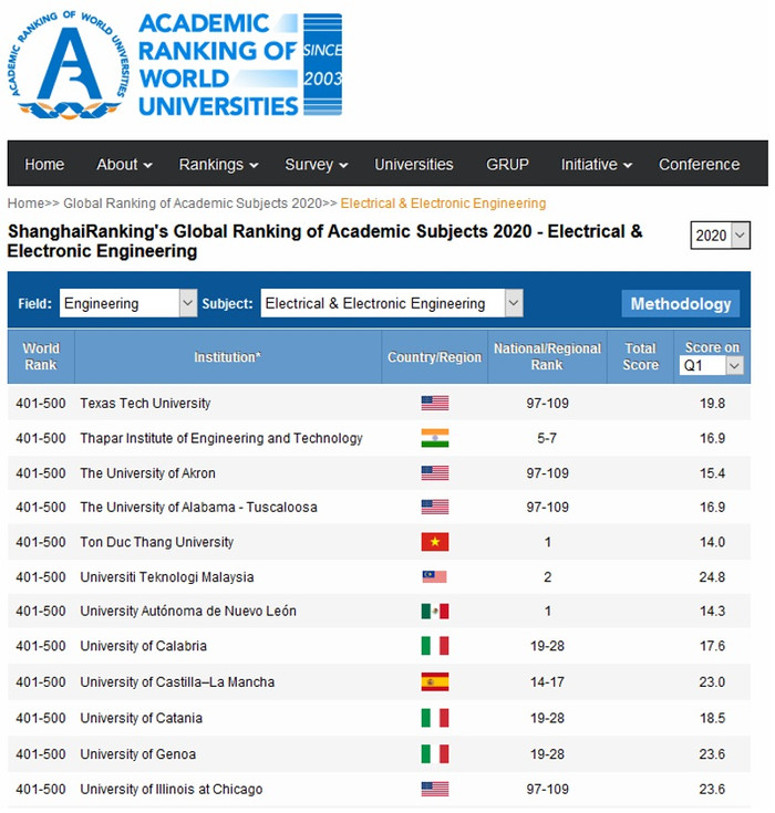 Nhóm ngành điện-điện tử của trường Đại học Tôn Đức Thắng đã đứng chung top với những tên tuổi lừng lẫy như Đại học kỹ thuật Texas (Texas Tech University), Đại học kỹ thuật Malaysia, Đại học Illinois.