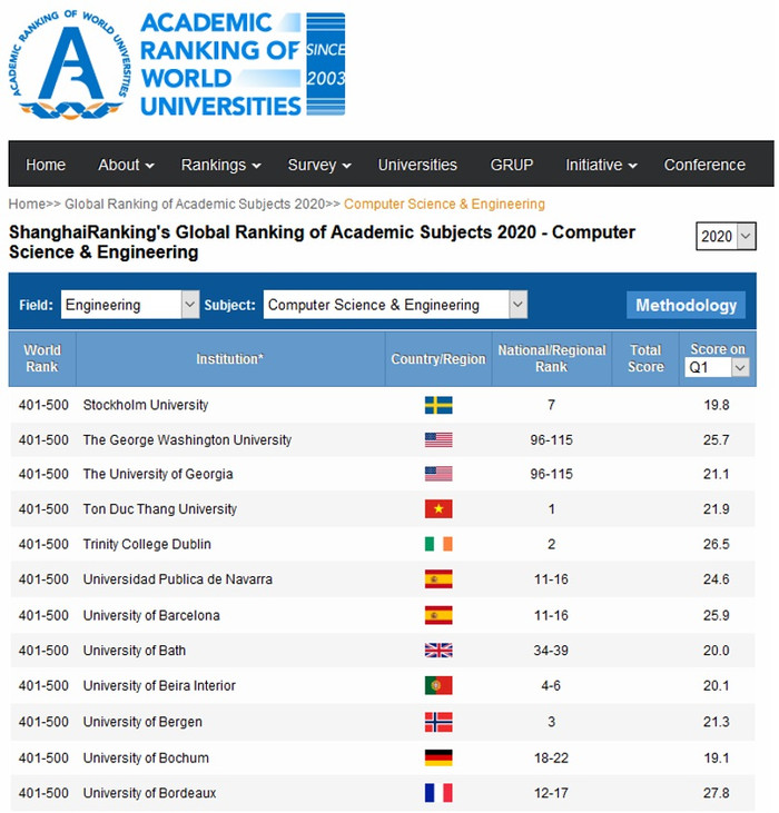 Và Nhóm ngành khoa học máy tính thì cùng nhóm với các đại học danh tiếng khác như Đại học George Washington, Hoa Kỳ; Đại học Stockholm, Thụy Điển, Đại học Bordeaux, Pháp; Đại học Barcelona, Tây Ban Nha. Những trường lâu đời và được nhà nước đầu tư rất nhiều tiền của.