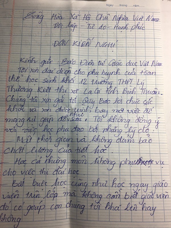 | Lá đơn kiến nghị của đại diện phụ huynh ở thị xa La Gi, tỉnh Bình Thuận gửi đến Báo Điện tử Giáo dục Việt Nam. |
