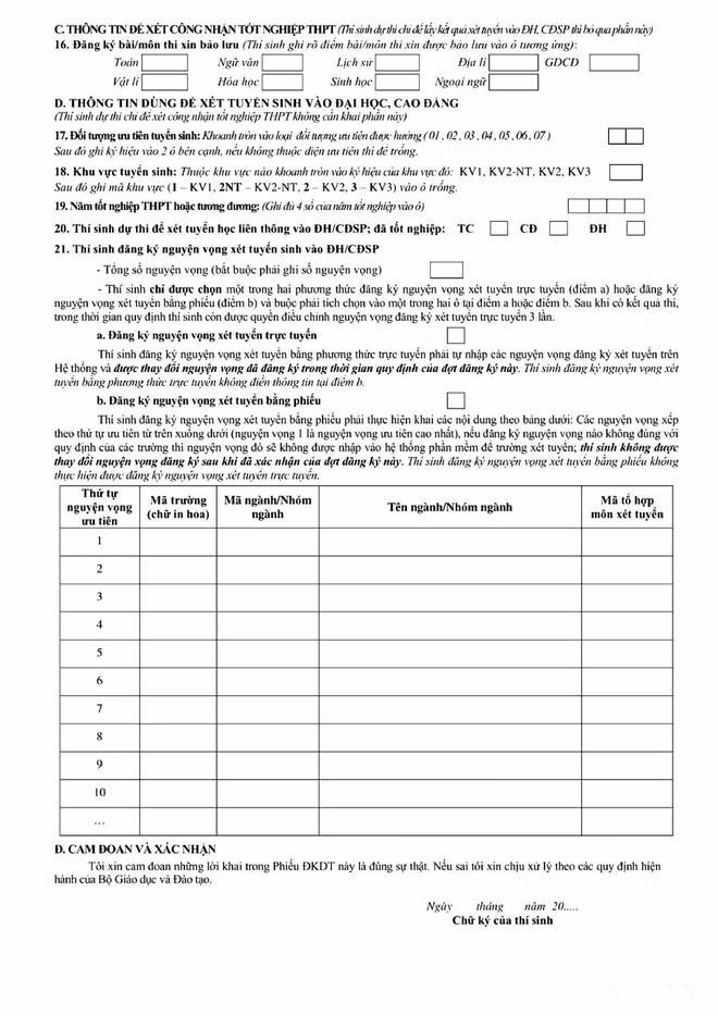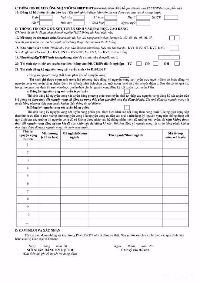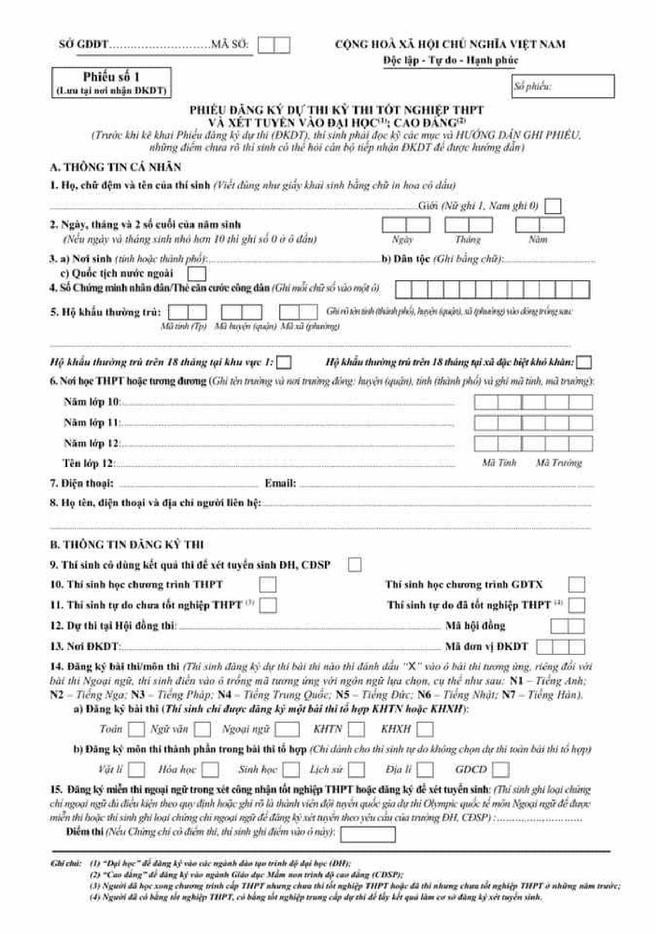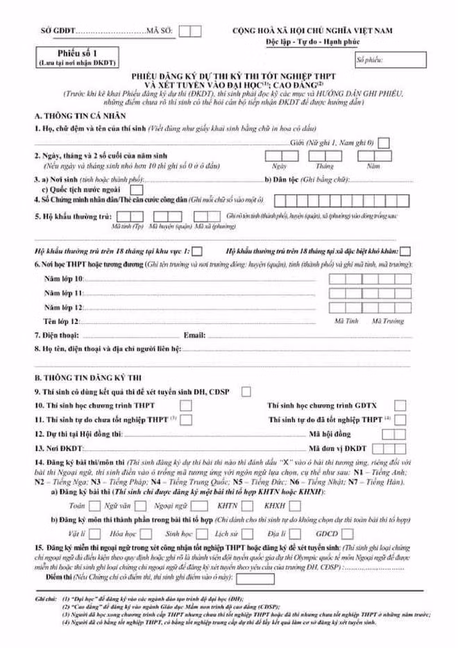 Thí sinh in mẫu phiếu và hướng dẫn ghi phiếu lên giấy khổ A4, in hai mặt.