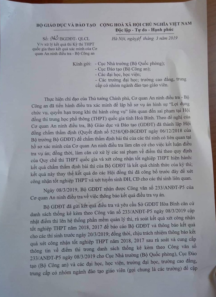 Ngay sau khi có kết quả điều tra về gian lận thi cử tại Hòa Bình, ngày 11/3, Bộ Giáo dục và Đào tạo đã có công văn gửi Cục Nhà trường của Bộ Quốc phòng và Cục Đào tạo của Bộ Công an đề nghị rà soát kết quả xét tuyển đại học năm 2018, 2017.