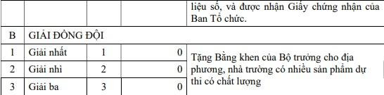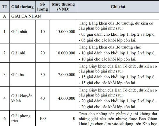 Số lượng giải thưởng có thể thay đổi tùy thuộc vào chất lượng của sản phẩmdự thi. Mức thưởng có thể thay đổi tùy thuộc vào nguồn kinh phí xã hội hóa; giảithưởng có thể trao bằng bằng tiền mặt hoặc quy đổi sang hiện vật có giá trị tương đương.