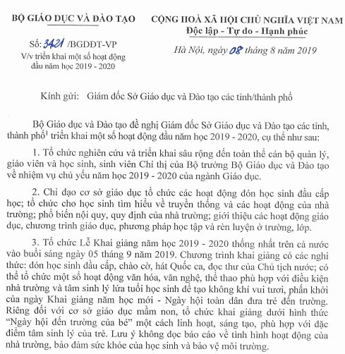 Về tổ chức lễ khai giảng năm học 2019-2020, Bộ cho biết tổ chức thống nhất trên cả nước vào buổi sáng ngày 5/9/2019.