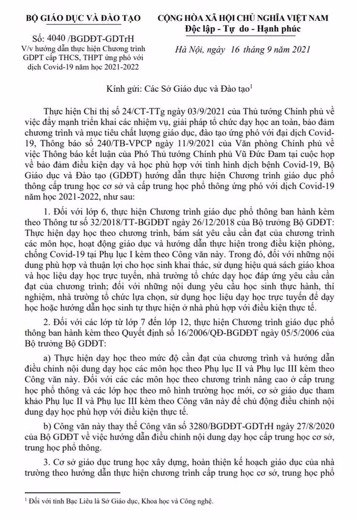 Bộ Giáo dục và Đào tạo ban hành Công văn số 4040/BGDĐT-GDTrH hướng dẫn thực hiện Chương trình giáo dục phổ thông cấp trung học cơ sở, trung học phổ thông năm học 2021-2022 ứng phó với dịch Covid-19. Công văn kèm theo phụ lục hướng dẫn thực hiện nội dung dạy học đối với từng môn, từng lớp ở 2 cấp học này.