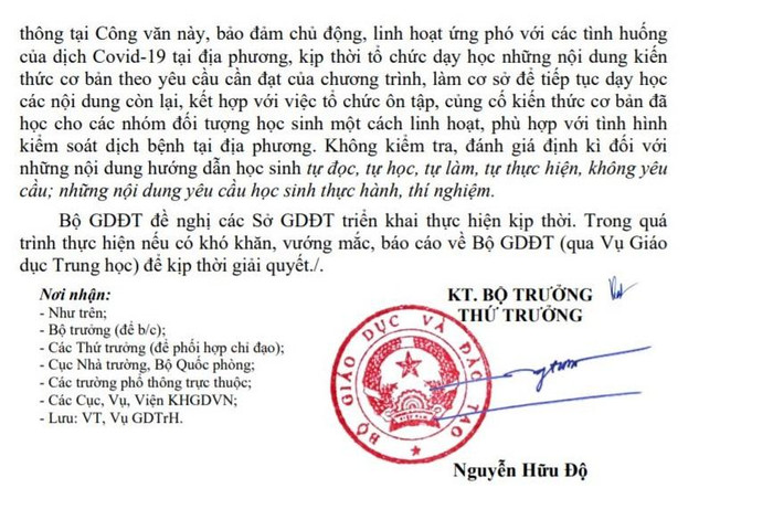 Đây đồng thời là cơ sở để các cơ quan quản lý giáo dục, các nhà trường, giáo viên, học sinh có cách tiếp cận tốt nhất đảm bảo yêu cầu đầu ra của chương trình giáo dục trung học trước diễn biến phức tạp của dịch bệnh.