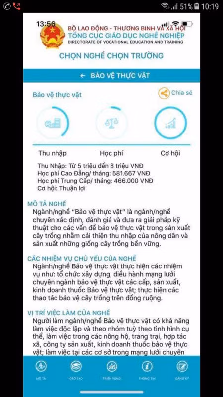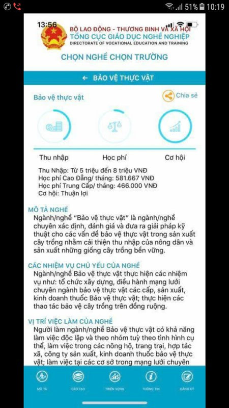 Được biết, cơ sở dữ liệu của ứng dụng Chọn nghề - Chọn trường đã cập nhật được toàn bộ danh mục nghề đào tạo trình độ Cao đẳng, trung cấp bao gồm 854 nghề, trong đó: 821 nghề trình độ Trung cấp, 558 nghề trình độ Cao đẳng. Thông tin mô tả các nghề đào tạo: 213 nghề được cập nhật thông tin.