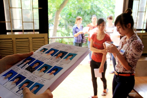| Thí sinh tranh thủ xem lại bài trước giờ vào phòng thi tại HV Ngoại giao (Ảnh Kim Ngân) |