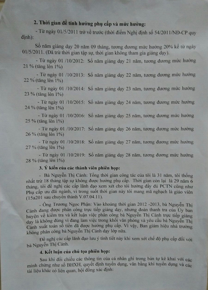 Hội đồng nhà trường đã tiến hành họp xét đề nghị phụ cấp thâm niên cho cô Cảnh, thành viên Hội đồng nhà trường đã đồng thuận đề nghị Hội đồng xét thâm niên của huyện xét cho cô giáo Cảnh được hưởng mức phụ cấp 29% (cô Cảnh có 31 năm công tác, trừ 18 tháng tập sự).