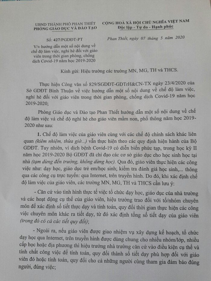 | Công văn 427 của Phòng Giáo dục và Đào tạo Phan Thiết chỉ đạo về việc quy đổi tiết dạy trong thời gian học sinh nghỉ dịch bệnh Covid-19 (Ảnh tác giả) |