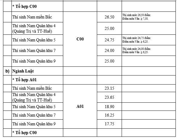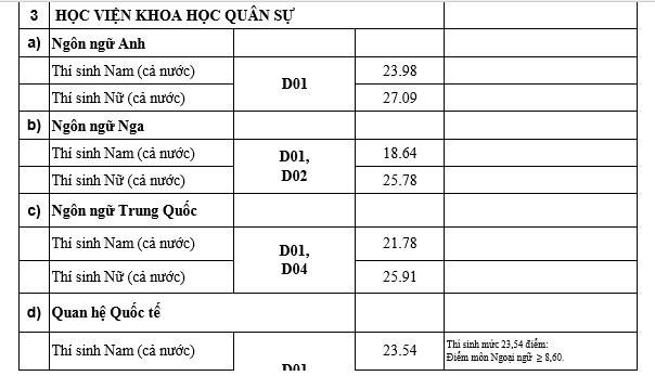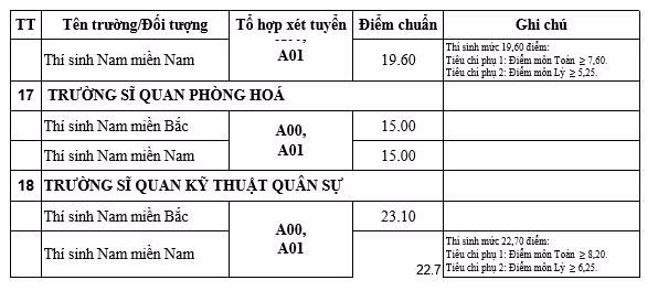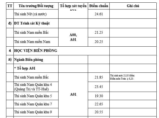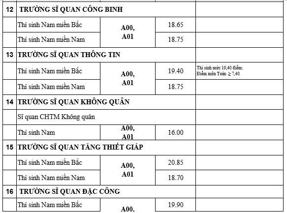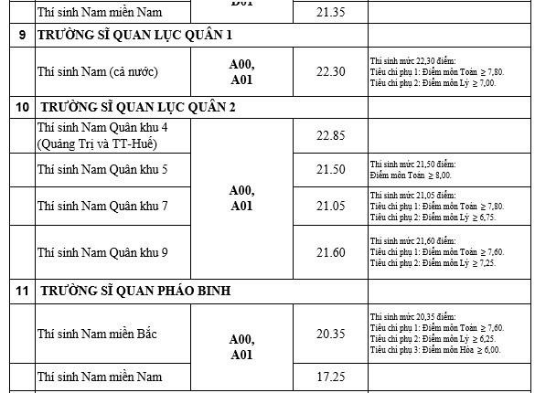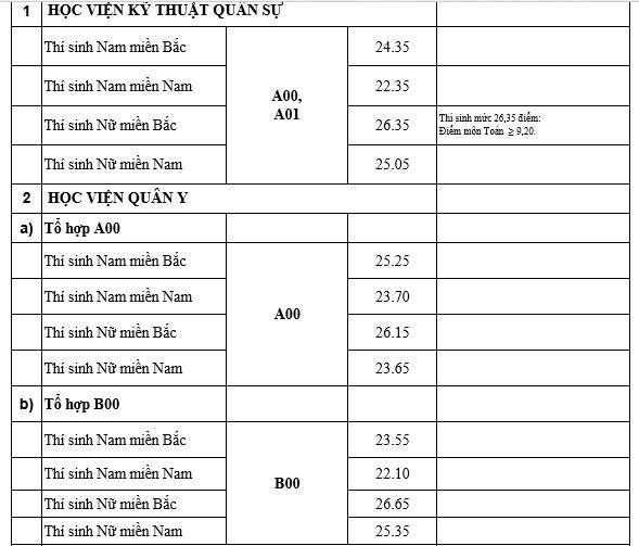Theo mức điểm chuẩn công bố của các trường quân đội thì các nhóm ngành có mức điểm khoảng từ 26 - trên 27 điểm. Những ngành có mức điểm thấp là trên dưới 19 điểm.