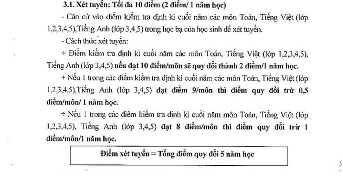 Để đăng ký dự thi vào trường, học sinh phải có tổng điểm kiểm tra định kỳ cuối năm môn Toán và Tiếng Việt (từ lớp 1 đến lớp 5) từ 18 trở lên/năm; điểm kiểm tra định kỳ cuối năm môn Tiếng Anh (đối với lớp 3,4,5) đạt từ 8 điểm trở lên/năm.