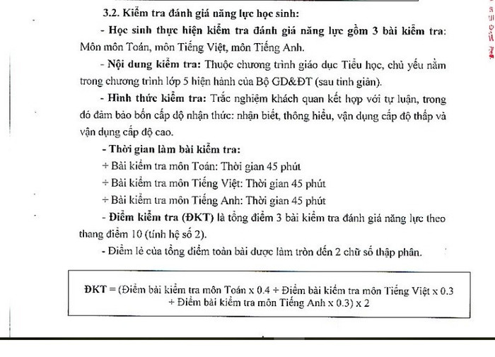 Về kiểm tra đánh giá năng lực, học sinh sẽ phải thực hiện 3 bài kiểm tra môn Toán, Tiếng Việt, Tiếng Anh bằng hình thức trắc nghiệm kết hợp với tự luận.