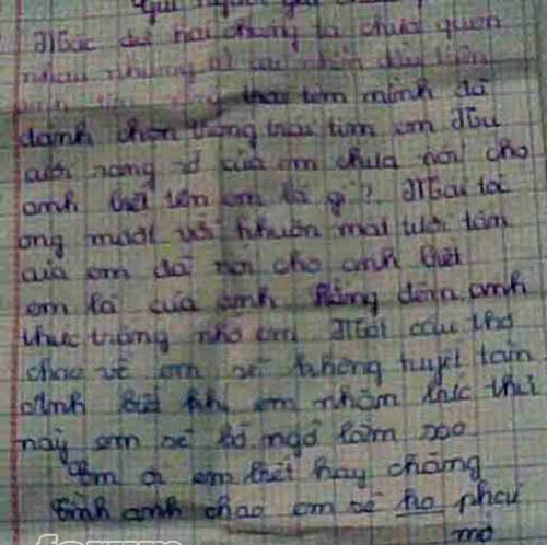Một cậu bạn học lớp 4 cũng có cảm xúc tương tự: "Mặc dù 2 chúng ta chưa quen nhau nhưng từ cái nhìn đầu tiên anh đã biết trái tim mình đã dành chọn trong trái tim. Nụ cười rạng rỡ của em chưa nói cho anh biết tên em là gì? Mái tóc óng mượt với khuôn mặt tươi tắn của em đã nói cho anh biết em là của anh. Hằng đêm anh thức trắng nhớ em. Một câu thơ chao về em sẽ không tuyết tàn (???). Anh biết khi em nhận đc bức thư này em sẽ bỡ ngỡ làm sao”.