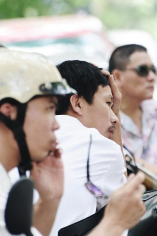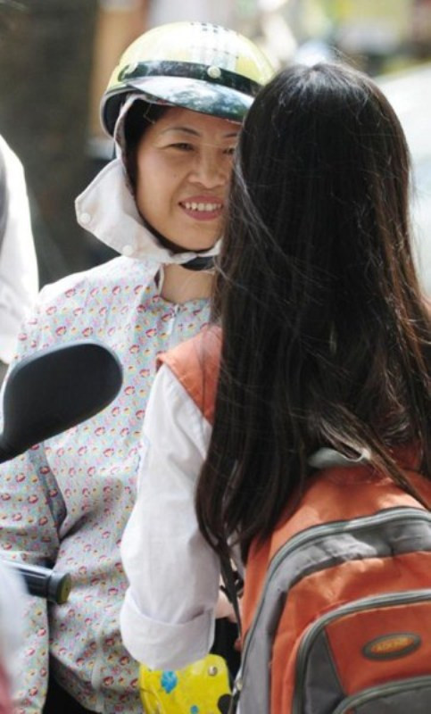 | Phía ngoài cổng trường rất nhiều phụ huynh xếp hàng chờ con dưới nắng. |