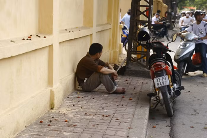 | Phụ huynh ngồi xếp hàng cạnh tường rào nhà trường chờ con làm bài thi. |