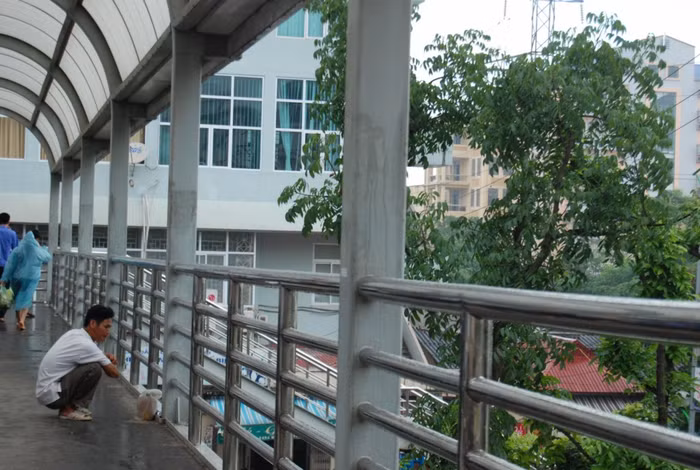 | Tại khu vực Hoàng Quốc Việt, nhiều phụ huynh chạy lên cầu đi bộ tránh mưa |