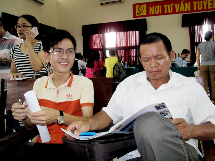 | Hai bố con tập trung khai và điều chỉnh nguyện vọng. |