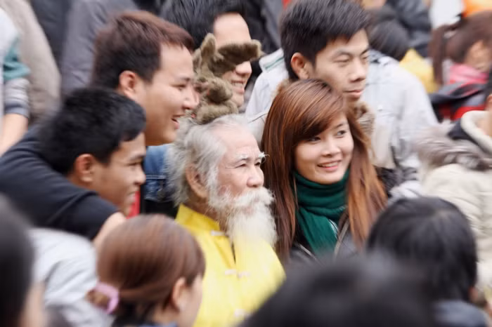 | Tranh thủ chụp ảnh kỉ niệm với mội cụ lão có mái tóc kỳ dị. |