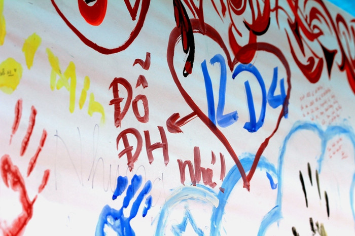 | Lớp 12A3 cùng các bạn học sinh cuối cấp khác thể hiện tình yêu thầy, cô, bạn bè qua thông điệp vẽ bằng tranh. |