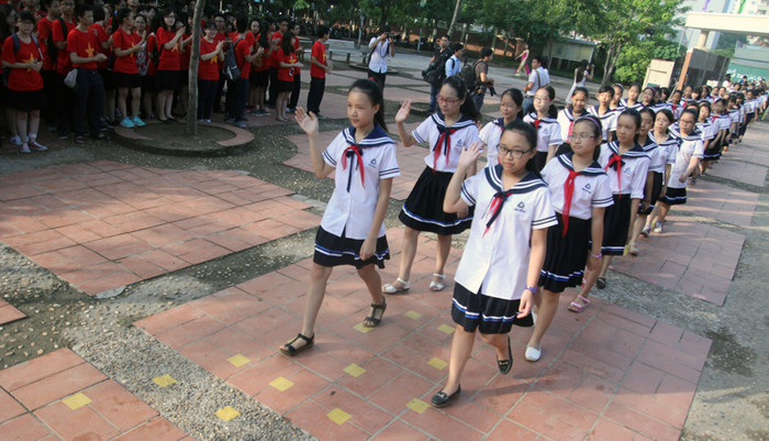 | Các em học sinh lớp 6 Trường phổ thông Lương Thế Vinh xếp hàng chuẩn bị tiến vào sân trường làm Lễ khai giảng. |