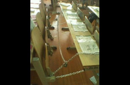 | ...nằm rải rác trên mặt sàn giảng đường sau khi được các nhân viên của trường dọn dẹp nhằm kết thúc cuộc chiến tranh giành chỗ ngồi. |