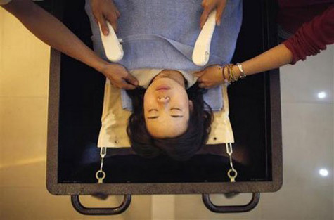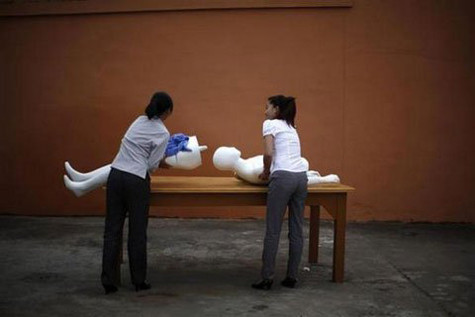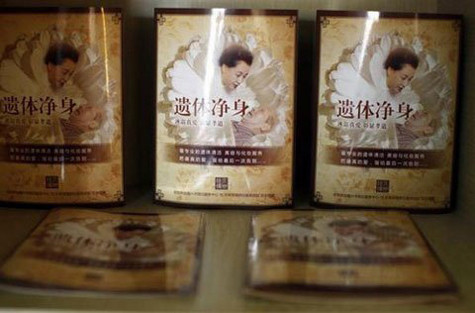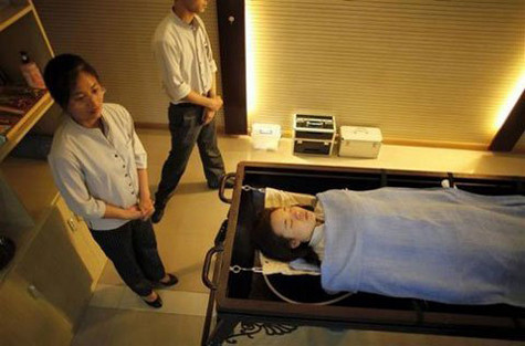 | Hầu hết những người trẻ có ý định làm việc trong nhà tang lễ đều vấp phải sự phản đối kịch liệt từ gia đình. Tuy vậy, Zheng Liangliang - một tân cử nhân vẫn kiên quyết chọn công việc này. Anh hi vọng một ngày nào đó những thành kiến đã tồn tại từ nhiều thế kỉ sẽ không còn nữa và nghề nghiệp của anh sẽ được xã hội chấp nhận. Ảnh một sinh viên đóng giả người chết |