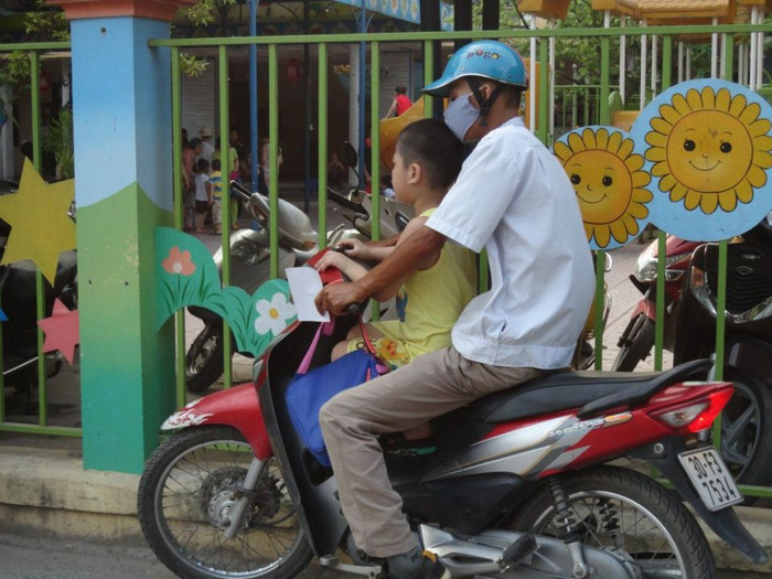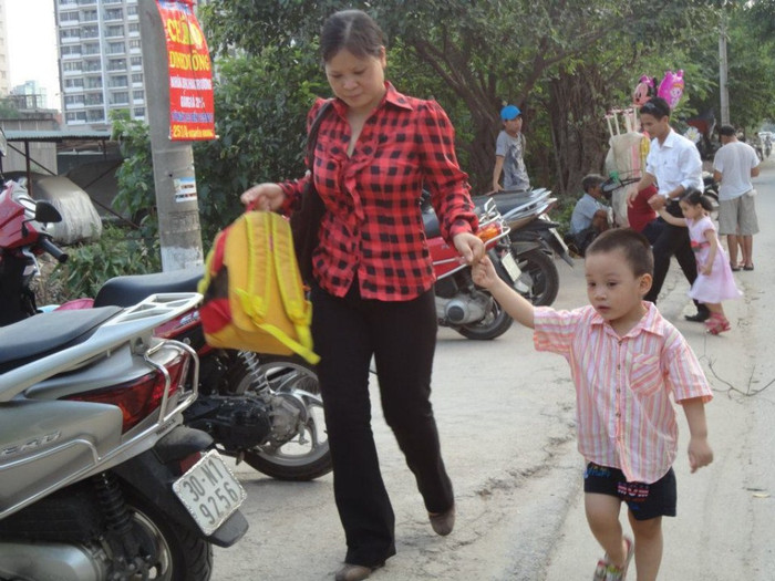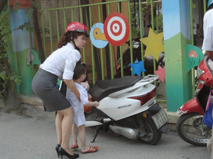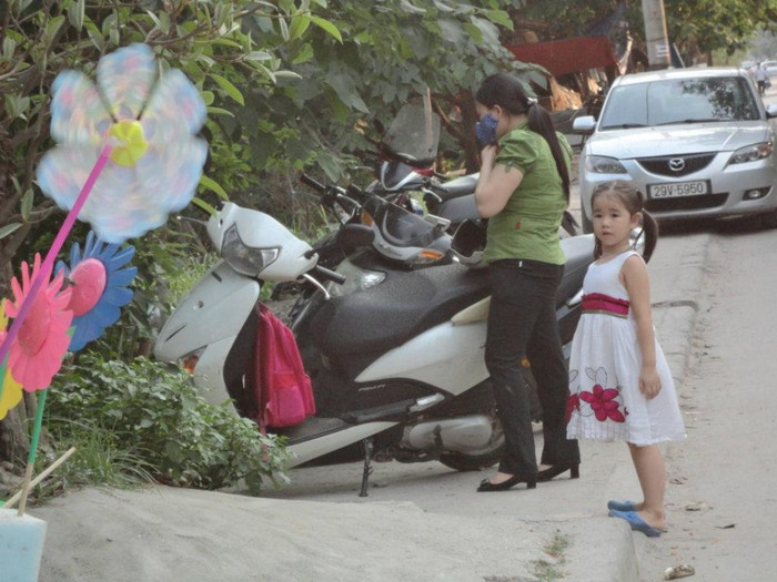 | Người mẹ đón con xong nhanh chóng quay đầu xe để không bị tắc đường. |