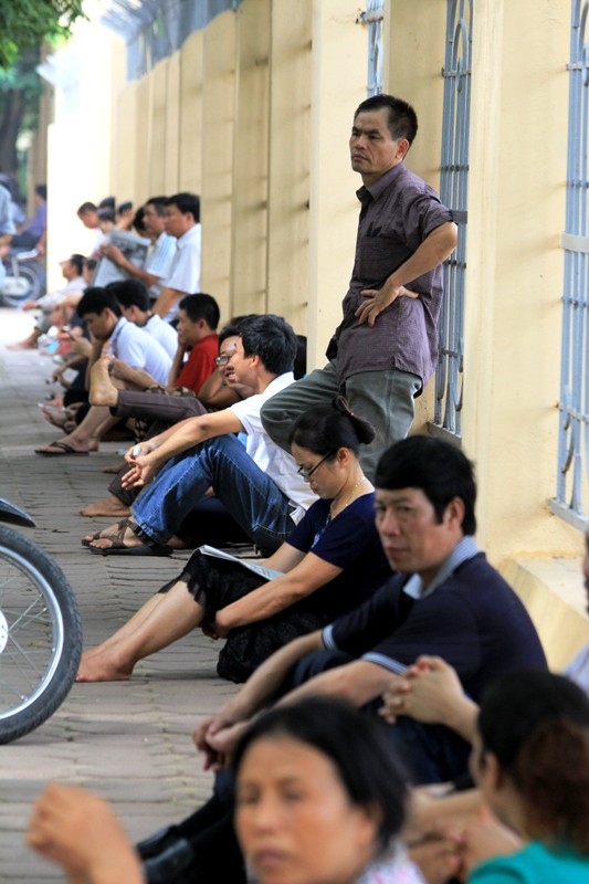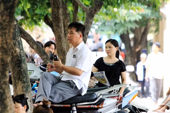| Thí sinh dự thi môn Toán với thời lượng 120 phút. Trong thời gian làm bài, nhiều phụ “vật vờ” chờ con dưới tiết trời oi bức buổi sáng. |