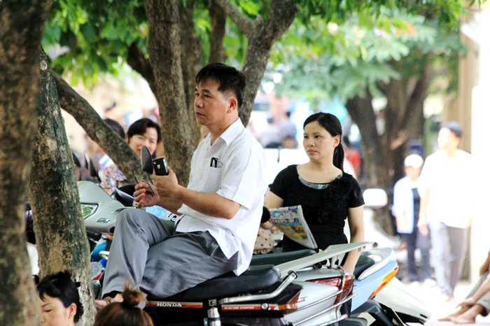 | Tại cổng trường THPT chuyên Sư phạm sáng nhiều phụ huynh các tỉnh đổ về cho con cọ xát kiến thức. |