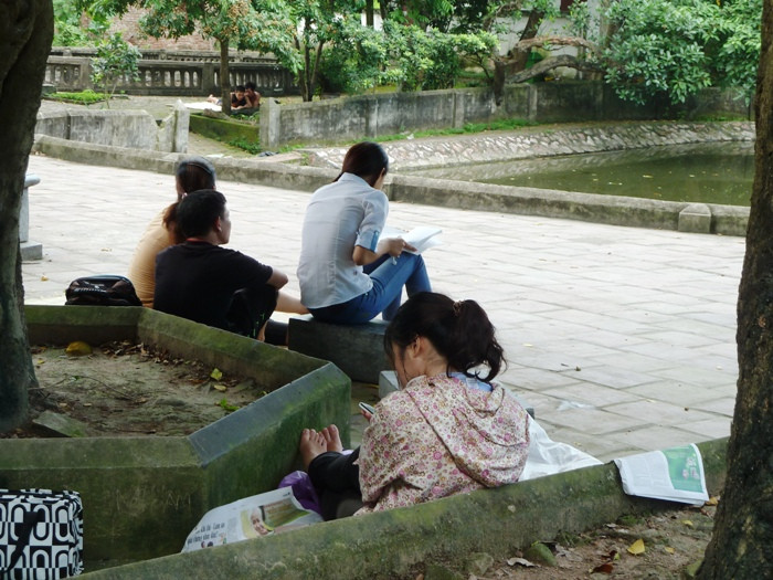 | Gốc cây, cột chùa, ghế đá trong ngôi chùa Láng (Hà Nội) là nơi mà người nhà thí sinh và sĩ tử tìm đến để nghỉ ngơi sau khi ăn cơm trưa. |