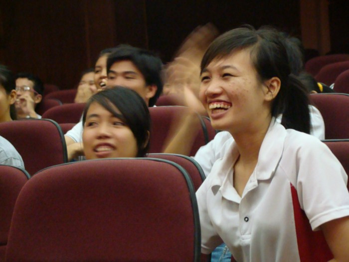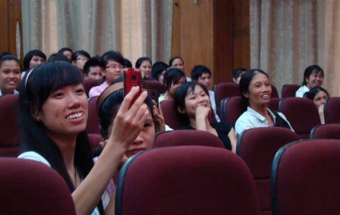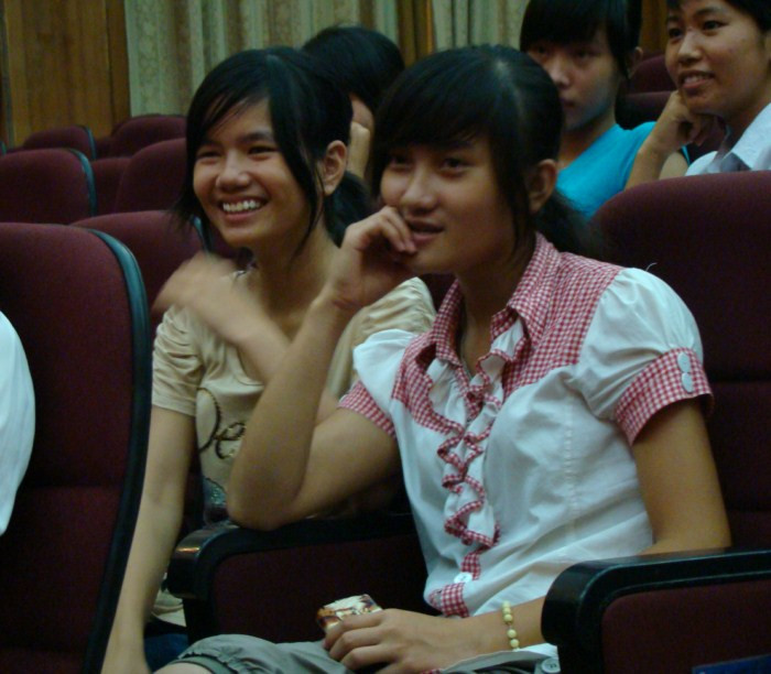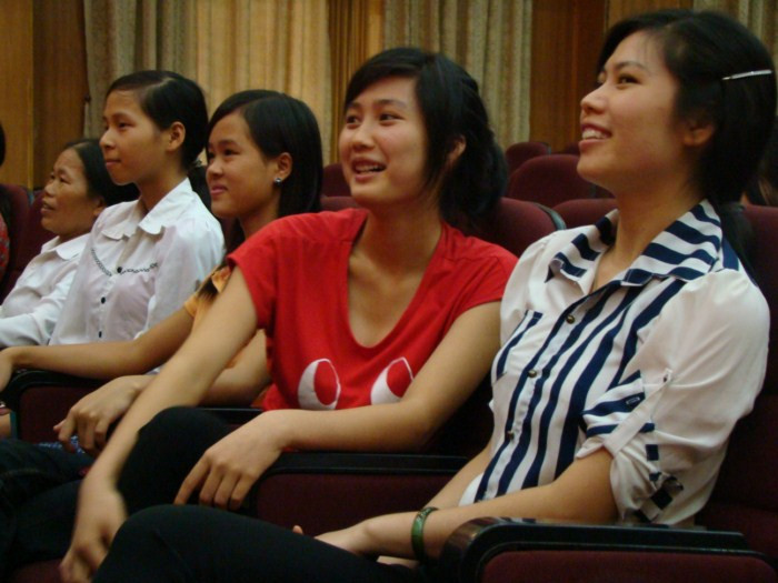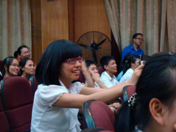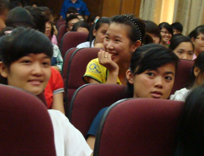 | Buổi tư vấn này mang màu sắc rất đặc biệt của trường ĐH Thủy Lợi, chương trình không khô cứng mà rất sôi nổi và vui vẻ. Các sĩ tử liên tục đặt câu hỏi cho tổ tư vấn. |