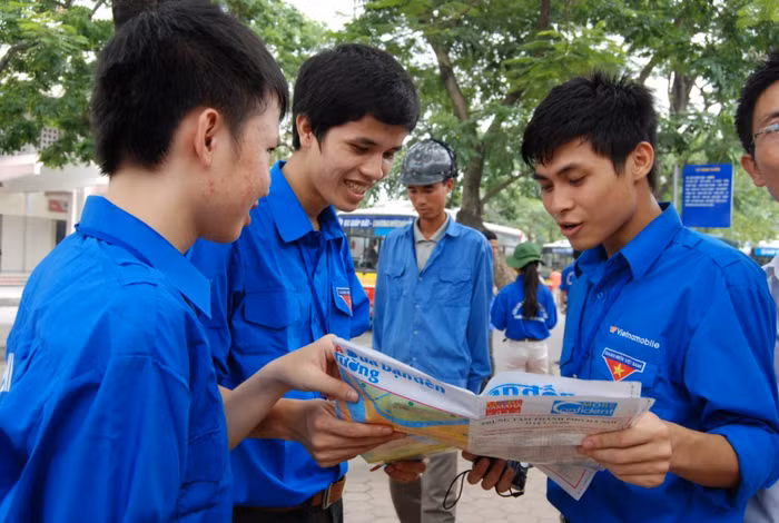 | Sinh viên tình nguyện hướng dẫn đường đi tại bến xe bus cho phụ huynh. |