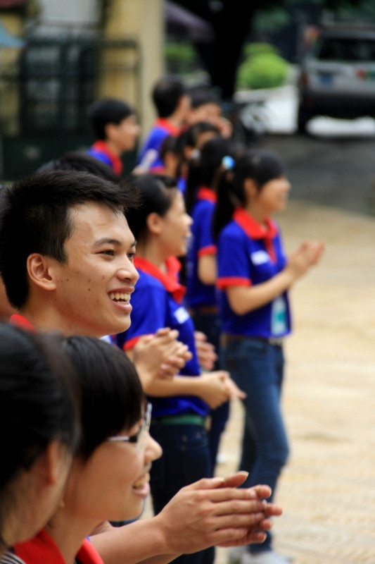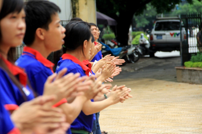 | Trong khi chờ đoàn xe, các tình nguyện viên tập dượt các công tác đảm bảo tốt nhất để đón các thí sinh. |