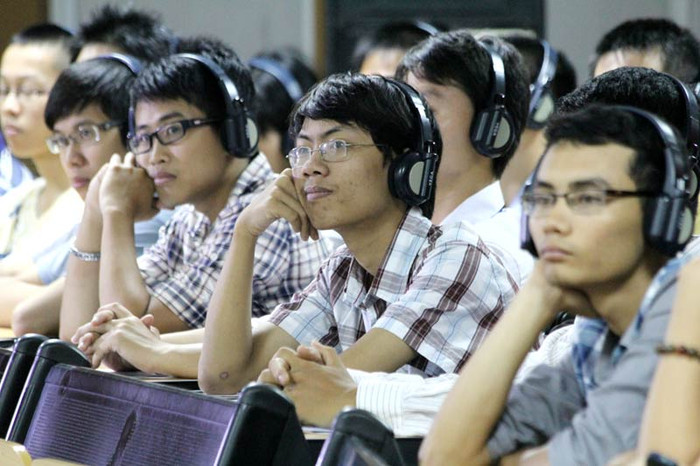 | Học sinh và sinh viên các trường ĐH chăm chú lắng nghe bài thuyết trình của “Thiên tài sống” Hiroshi Ishiguro. |