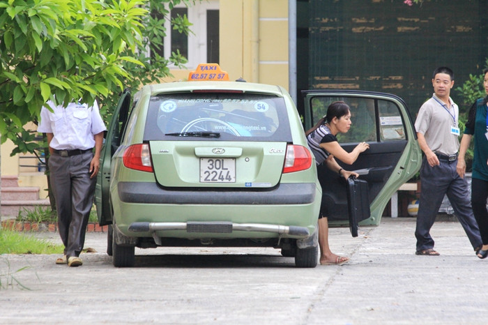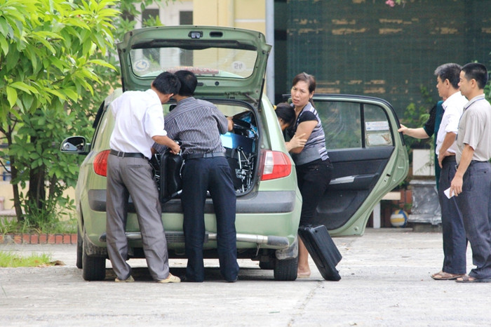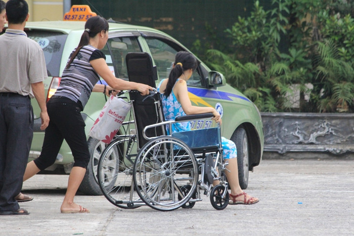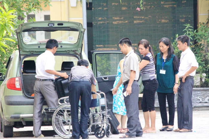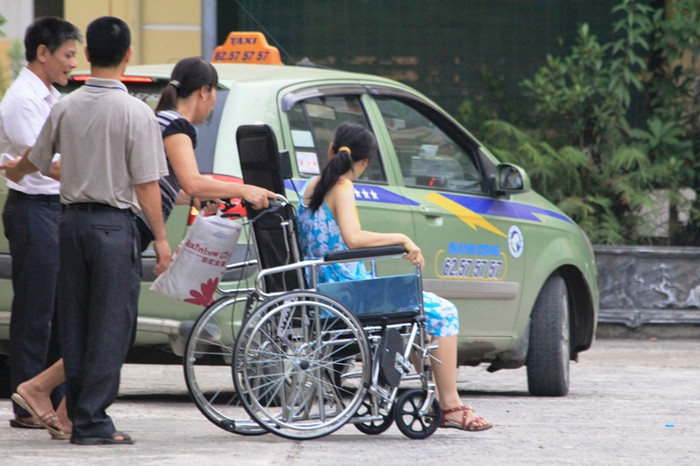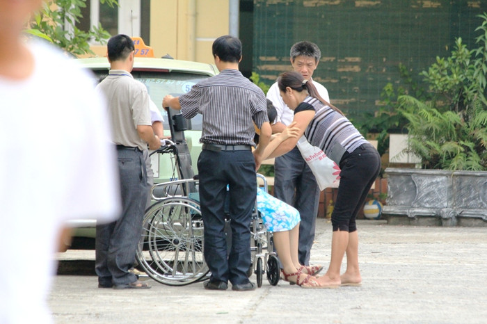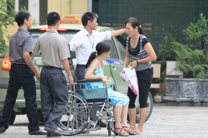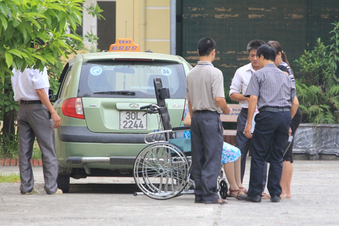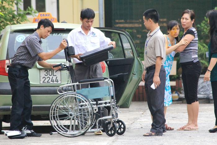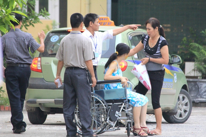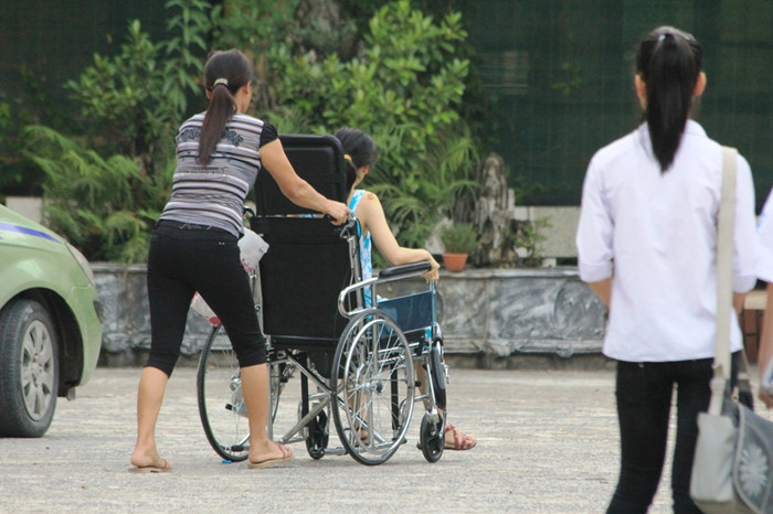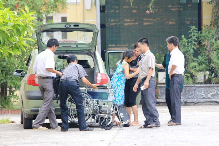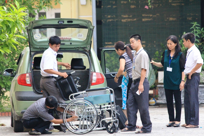 | Cô bé được chuyển lên phòng thi bằng xe lăn của gia đình. |