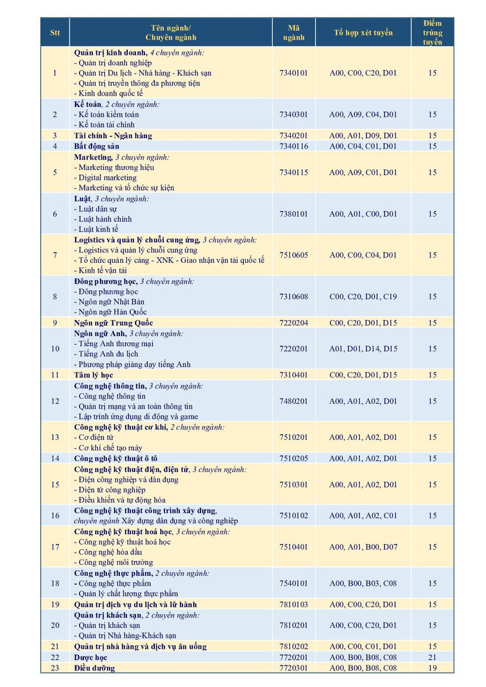 Bảng điểm chuẩn các ngành, chuyên ngành như sau: